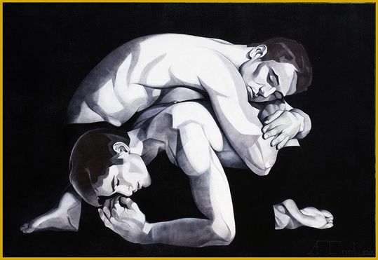 Rien ne bouge et pourtant la vie est présente. Les corps occupent largement l'espace. Les muscles sont saillants ils dévoilent leur morphologie avec une impudicité qui les rend étranges.